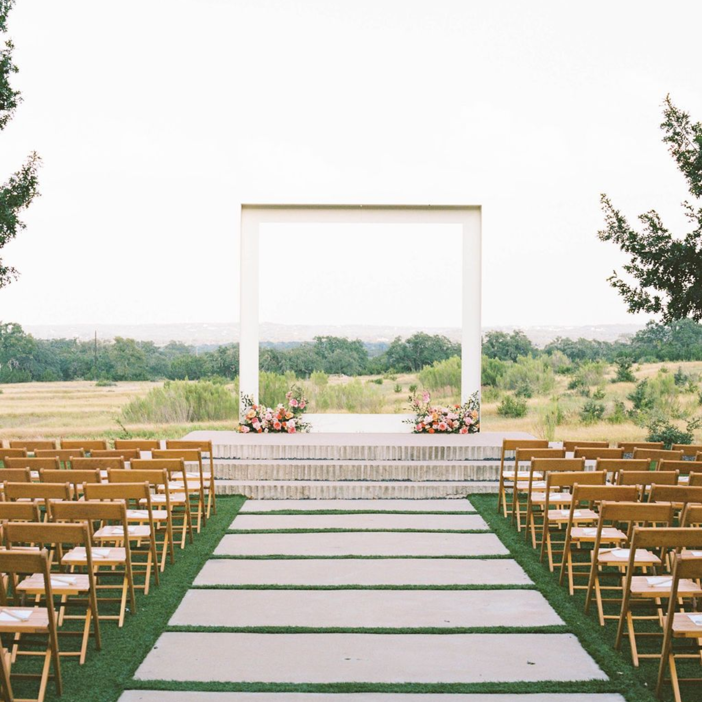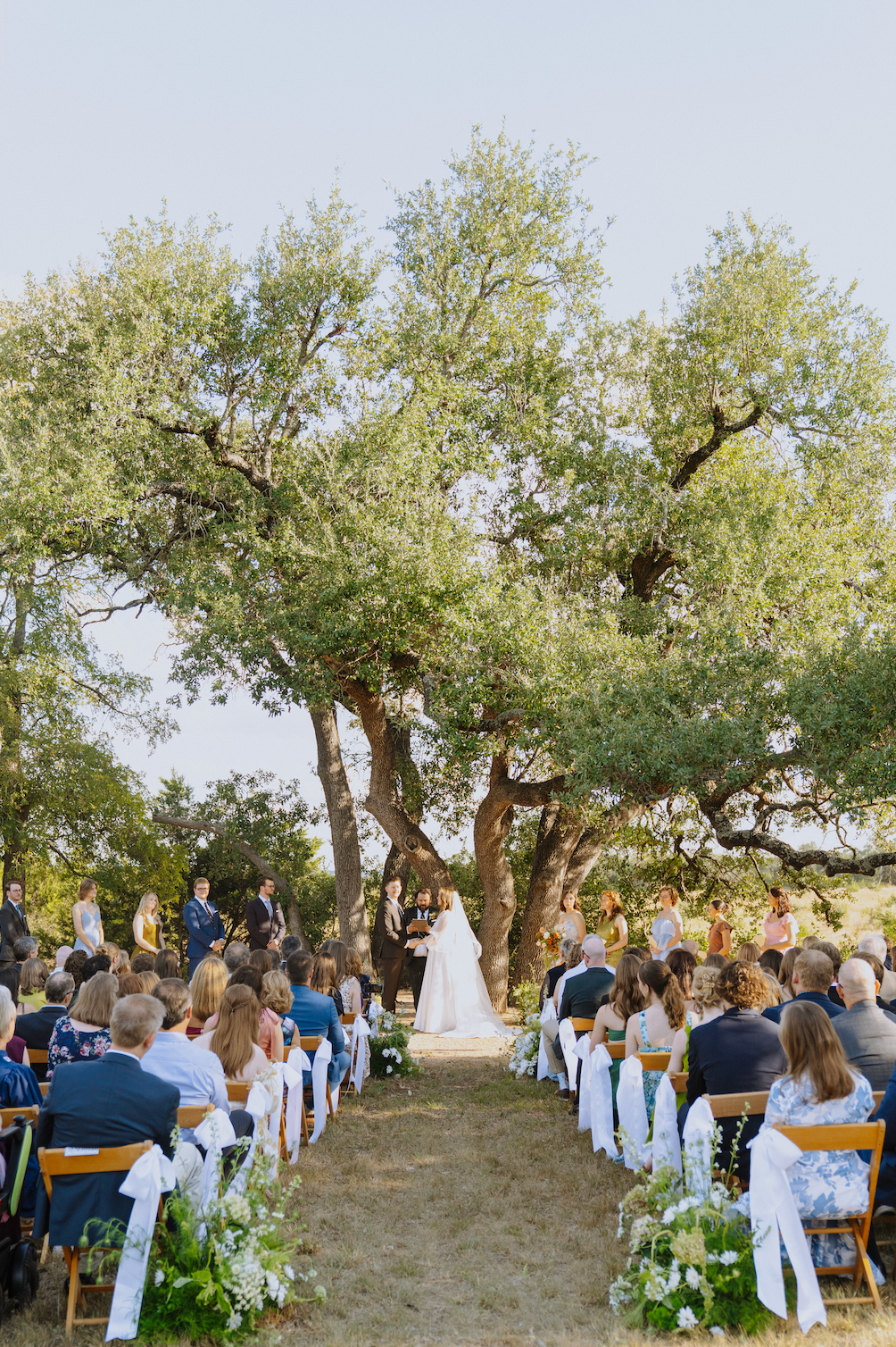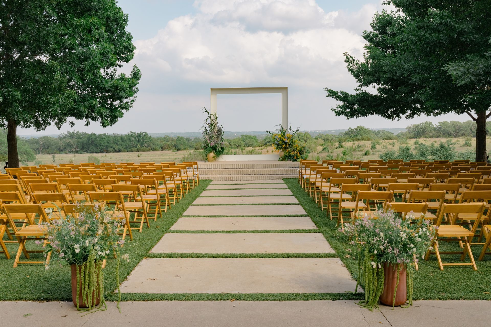 Create the ceremony of your dreams with views of the rolling Texas Hill Country. Our large ceremony site is surrounded by native grasses and enclosed by two rows of Texas Red Oaks. This versatile lawn is designed to host every moment - from the ceremony to cocktail hour, receptions, and beyond. Add florals or greenery to our simple altar and design your own layout to make the space your own.